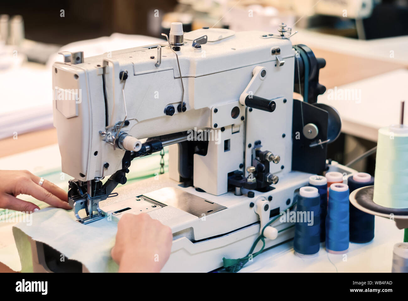 Industrial Overlock Sewing Machine And Hands Of Seamstress At Work In The Garment Factory Stock Photo Alamy